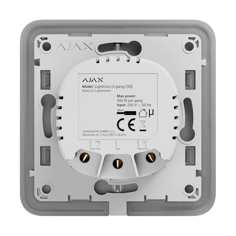Реле для двухклавишного выключателя, дальность радиосвязи до 1100 м, мощность коммутируемого прибора от 5 до 600 Вт, напряжение питания 230 В, 50 Гц, среднее потребление до 200 мВт, защита по току 2,6 А, форм-фактор выключателя европейского типа, IP20, -10...+40°С, 76,3 х 72,3 х 29,2 мм