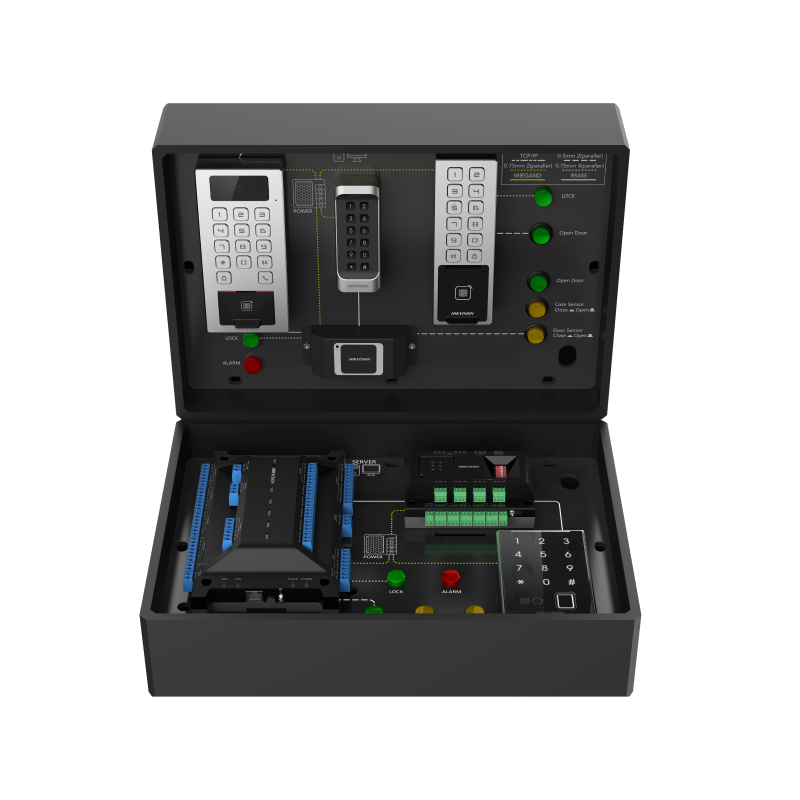 Демонстрационный комплект контроля доступа содержит: контроллер доступа DS-K2702WX-E1(P), модуль доступа DS-K2M002X, считыватель карт DS-K1109DKFB-QR, терминал контроля доступа DS-K1T502DBFWX-C, безопасный блок управления дверью DS-K2M061, считыватель карт DS-K1107AMK и терминал контроля доступа DS-K1T805MBFWX.