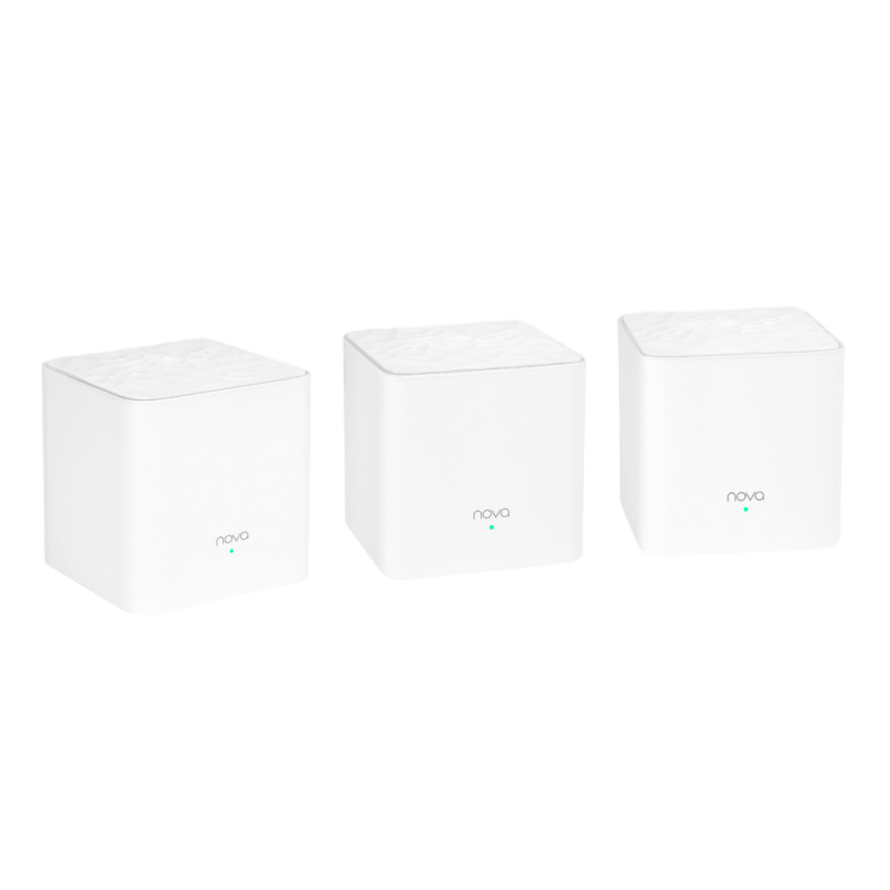 Mesh Wi-Fi система. Стандарты Wi-Fi: Wi-Fi 5 (802.11ac) / Wi-Fi 4 (802.11n), порты и интерфейсы: 2×Fast Ethernet (WAN/LAN), частота передачи: 2.4 GHz & 5 GHz, скорость передачи: 5 GHz до 867 Мбит/с / 2.4 GHz до 300 Мбит/с, функции: MU-MIMO, Beamforming, Smart QoS, бесшовный роуминг, управление через приложение Tenda, размеры (Ш×В×Г): 9 × 9 × 9 см. Комплектация: Mesh устройства — 3 шт., адаптер питания — 3 шт., Ethernet кабель — 1 шт., инструкция, площадь покрытия Wi-Fi до 300м².